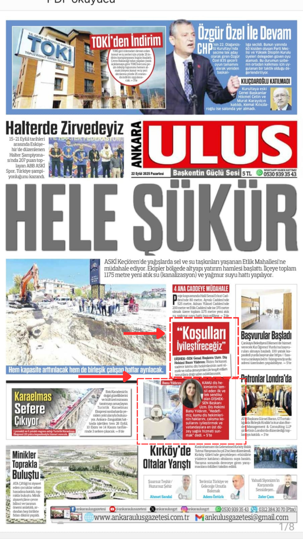 Kamu diş hekimlerini temsil eden ilk ve tek sendika olan Diş Hekimliği Sendikası (DİŞHEK-SEN) Genel Başkanı Uzm. Diş Hekimi Banu Yıldırım, sendikanın kurulma amacını, kısa ve uzun vadeli hedeflerini Ulus’a anlattı. Diş hekimliğinin tıp hekimliğinden farklı dinamiklere sahip olduğunu ve mevcut sendikaların diş hekimlerine özel temsil sağlayamadığını belirten Yıldırım, “Var olan yapılar sorunlarımızı dile getirmiyor, çözüm üretmiyor ve diş hastanelerini ziyaret etmiyor. Bizim amacımız, saha deneyimleriyle tespit edilen sorunlara odaklanmak” dedi. Kısa vadede sendikanın tanınırlığını artırmayı hedeflediklerini belirten Yıldırım, uzun vadede ise üye sayısının artmasıyla kamu diş hekimliği sorunlarına kalıcı çözümler getireceklerini ifade etti.